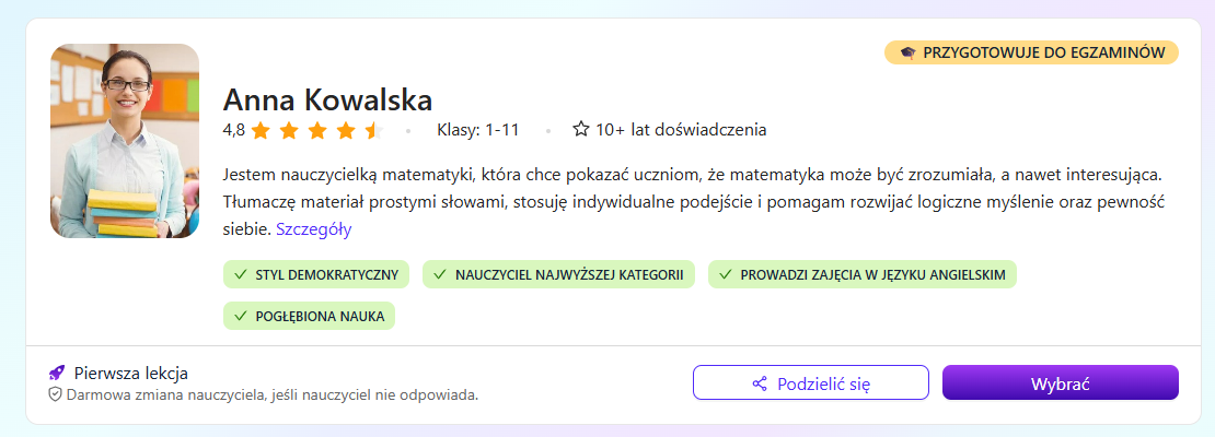 - Rozszerz zakres klas, dla których możesz prowadzić zajęcia. Im więcej klas obejmiesz, tym więcej uczniów będzie mogło wybrać właśnie Ciebie.