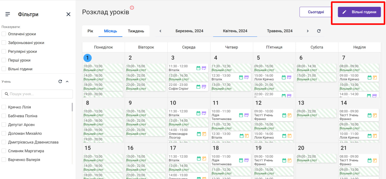 Із середовища "Календар" можна легко перейти на інтерфейс Редагування вільних годин, просто потрібно натиснути кнопку Вільні години: