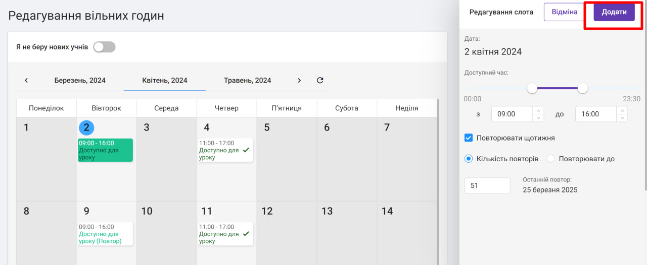 Також ви можете обрати, чи потрібно відкрити вільні години лише в конкретний день, який ви зараз редагуєте (тобто зняти галочку "Повторювати щотижня"), чи навпаки, повторювати цю подію щотижня і обрати до якої дати це робити.