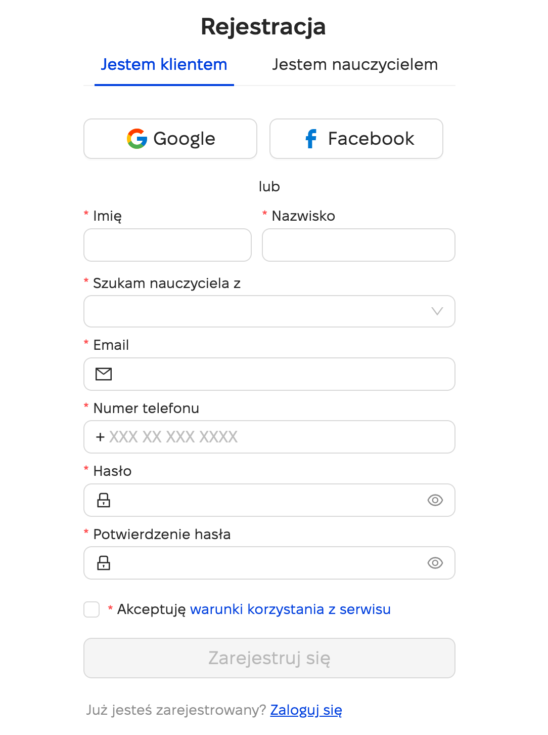 Przejdź na stronę Rejestracja i kliknij Jestem klientem.