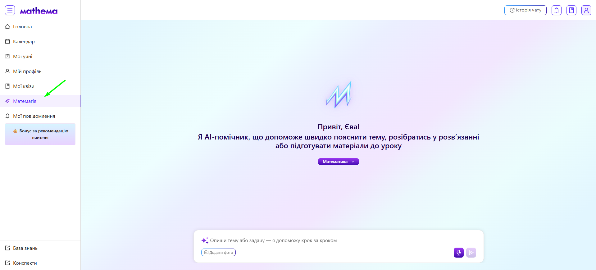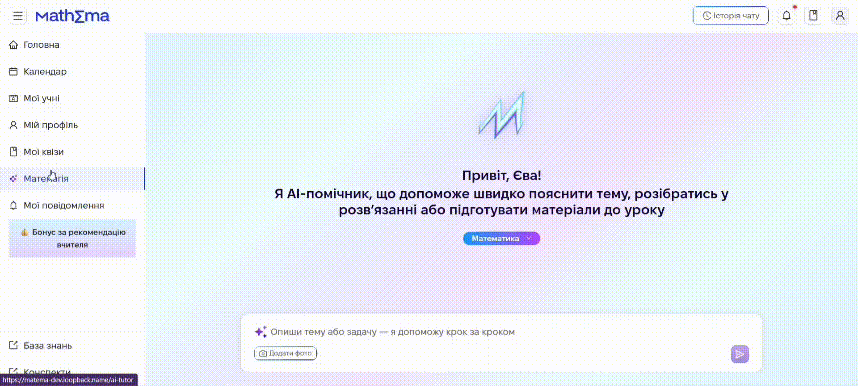 Ми створили для вас AI-помічника «Матемагія», що спрощує підготовку до уроків, генерує індивідуальні завдання та пояснює складні теми доступною мовою.
