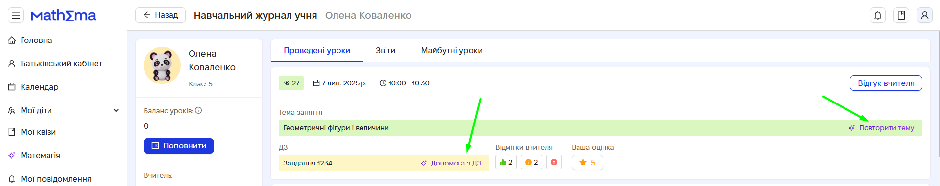 Ви також можете швидко перейти до AI-помічника через Журнал учня, Для цього оберіть урок, який потрібно повторити, та натисніть на кнопку «Виконати ДЗ» або «Повторити тему».