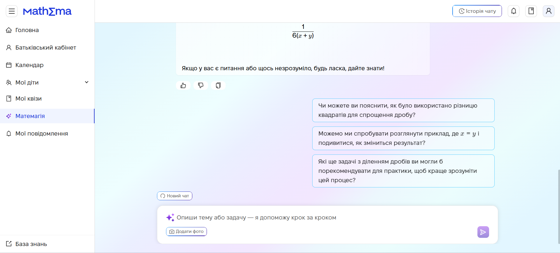 Якщо вам або вашій дитині потрібна допомога з математикою між уроками, скористайтеся AI-помічником «Матемагія». Він створений для того, щоб підтримувати самостійне навчання, пояснювати матеріал і тренувати логічне мислення.