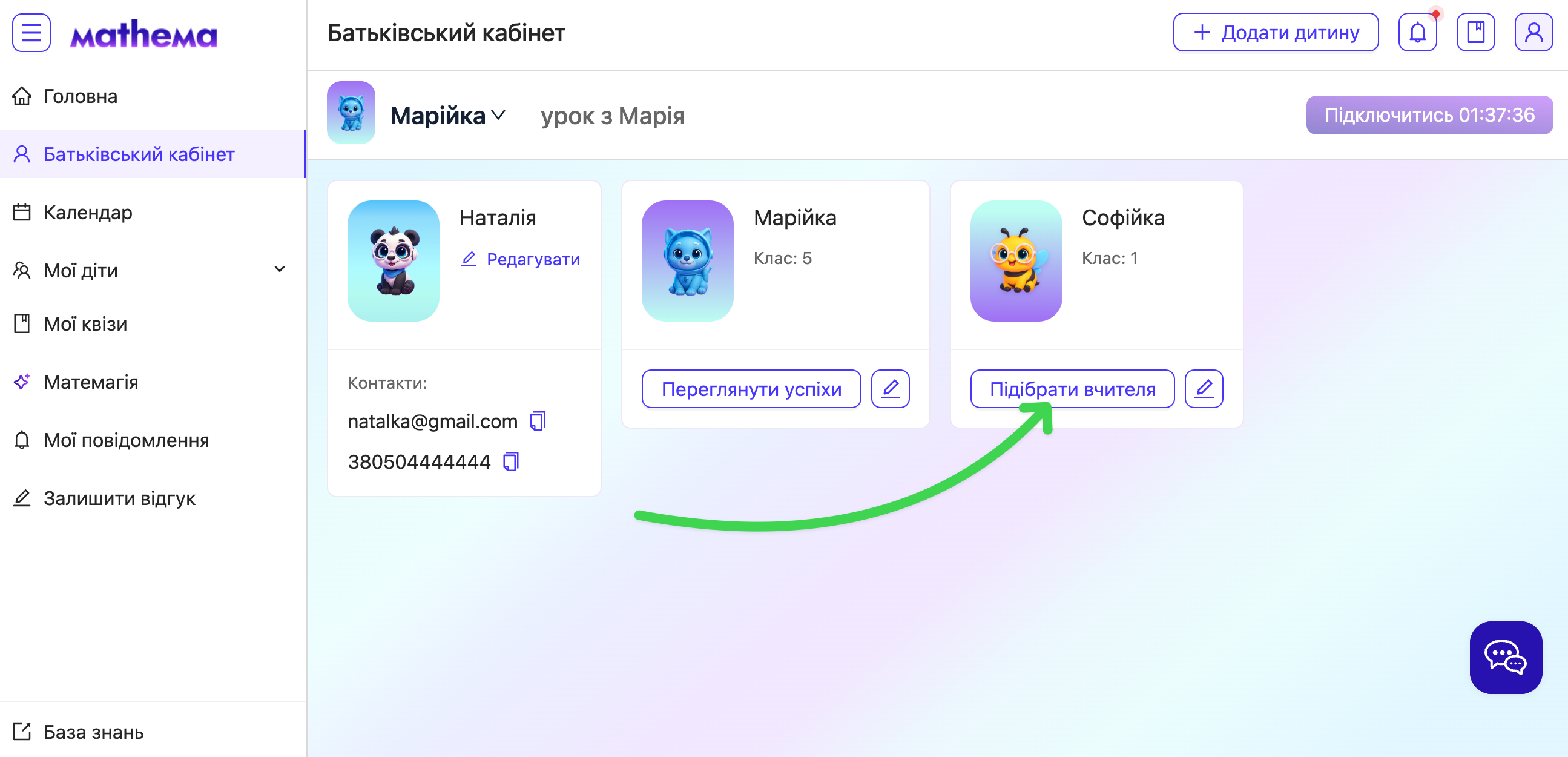 Перейдіть у Батьківський кабінет і на профілі дитини натисніть Підібрати вчителя.