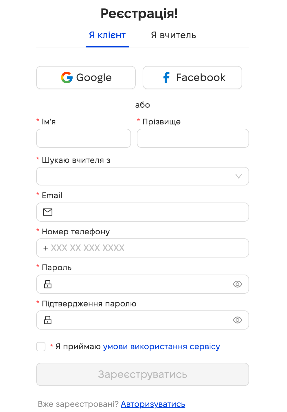 - Перейдіть на сторінку Реєстрація і натисніть Я клієнт.