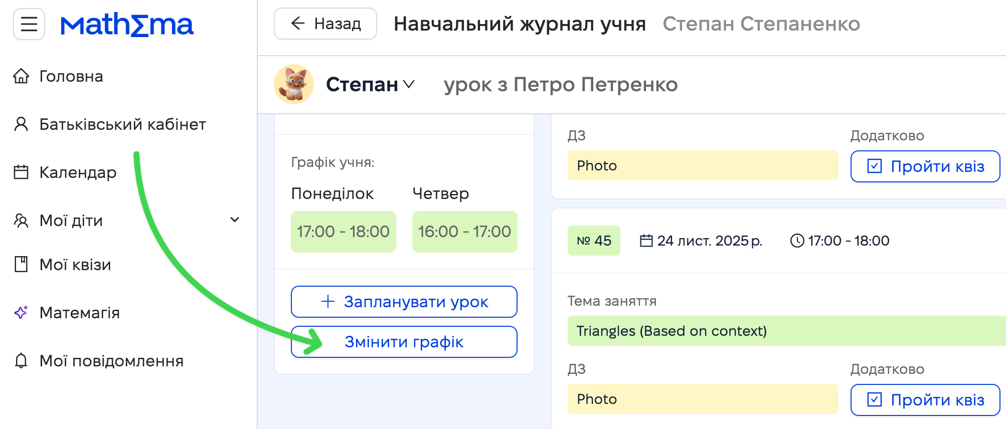 У Mathema ви можете самостійно змінювати регулярний графік без узгоджень і очікувань.